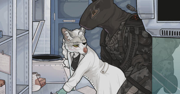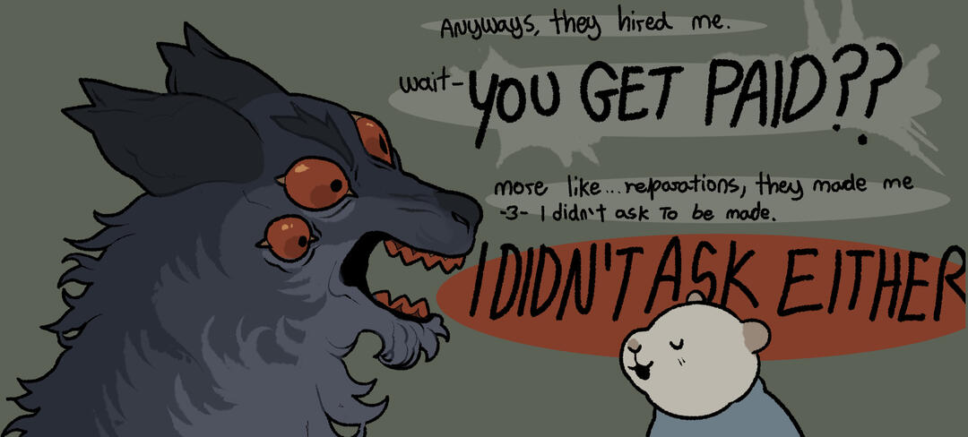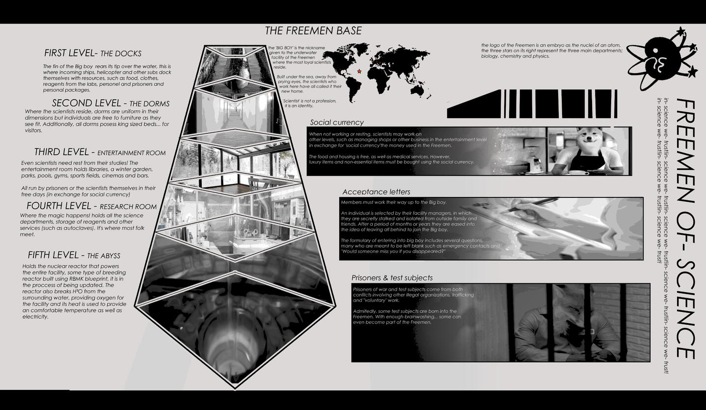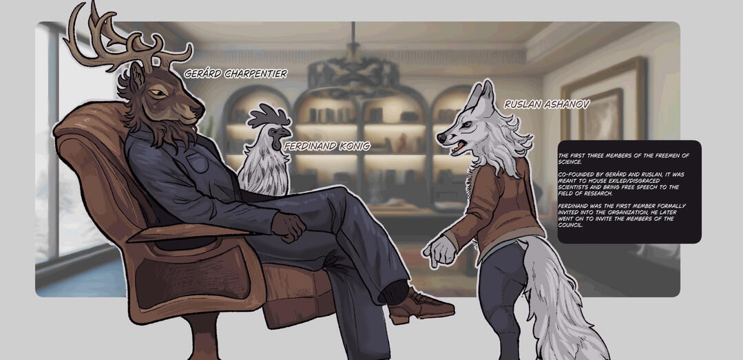 most characters belong to an terrorist organization called 'the freemen of science'.the Freemen of Science (often shortened to just 'Freemen'), originally an organization that would aid scientists who desperately needed funding for small "useless" research. It was Ruslan's idea, a marine biologist who was very fond of polychaetes (Marine worms) native to a small pond. He miserably tried to save them but had no money to help himself, he reached out to Gerárd, a rich man, who saw those small projects as potential investments for his growing bank. Ferdinand was a later addition, but an important one, he had been giving out lectures on genetics after being previously fired from his job in IVF for... misconduct.The Freemen of science grew, and Gerárd found himself more infused with it, he raised facilities to invite poor researchers with promise of a future career in science, but he became careless in his screenings, dangerous people started filling the ranks. This was the beginning of a rapid decline, word spread, the exiled, shamed and the rotten clung to the Freemen like moths to a flame. Ruslan observed how the organization was growing and he confessed his worries to Ferdinand, a year later, the Freemen would be found of fraud, falsifying data, rubbing shoulders with eugenics, experimentation without consent and even kidnapping.Nowadays, the Freemen hide in the Leviathan's heart, coloquially known as the 'big boy'. What they do here is.. anyone's guess, really. But Gerárd is gone and Ash, his adoptive daughter took the mantle.