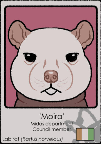 Rats are not sapient species in the Argoverse, so Moira is an exceptional case. She was originally an experiment from the Ireland facility, an attempt to construct a bioweapon from scratch. Instead, the engineered virus multiplied the brain cells, forming various small brains throughout the nervous system. This gave Moira intelligence and changed her physiology, at the cost of well.. having to pay taxes.