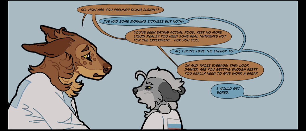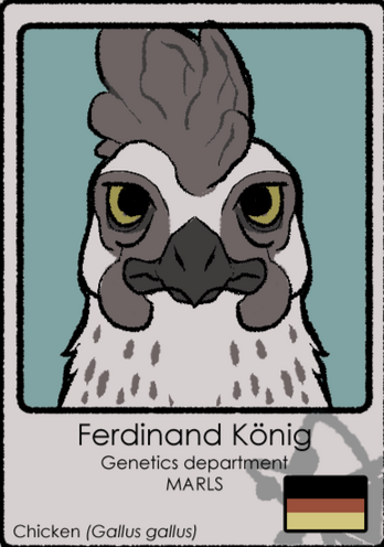 Former worker of Ferdinand, now manages her own project.Almost as science obsessed as her leader. Can spend hours without caring for herself if something needs to be done, unlike her leader, however, she takes no pleasure in it and would rather go home. Used to run an improvised "nursery" for the hybrid kids, refinely known as an 'education center', her combined knowledge of helping livestock deliver and genetic engineering has made Ferdinand's job of caring for both hybrids and surrogate very easy.